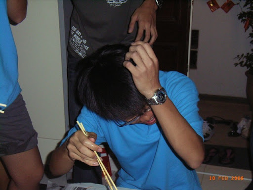 ~lots of interesting expression.. yiwei forcing chopsticks down my throat so i bit them to prevent them from going down. danz and valerie doing some kinda sign at the back.. OH! me and jingwen wore smwat the same attire: top = guitar shirt, bot = pants/shorts with army design.. 不愧是6years friend... i kinda like kevin's expression..LOL
